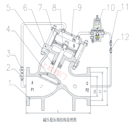 減壓穩(wěn)壓閥在運行前,主閥和導閥均處于關閉狀態(tài),閥門在使用時,介質進入進口端,并流入主閥板下方,同時部份流體通過連通管流向控制活塞上方和通過導閥流向出口端,此時出口端壓力P2小于進口端壓力P1 ,由于介質壓力的作用,主閥瓣向上運動,閥門開啟,介質流向出口端,P2隨之升高。當出現(xiàn)出口端壓力P2大于導閥調節(jié)彈簧加載力時,介質會通過連通管C反饋到導閥膜片下方,推動導閥瓣向關閉方向運動,減小介質流通面積,并通過連通管使主閥控制腔壓力Pb增加,使主閥膜片向下運動,推動主閥瓣向關閉運動,減小主閥流過的介質。這時,出口壓力P2隨之降低;反之若出口端壓力P2降低時,反饋到導閥膜片下方介質壓力小于調節(jié)彈簧的加載力,會使導閥瓣向開啟方向運動,通過反饋作用又會使主閥控制腔壓力下降,主閥瓣向開啟方向運動,增加主閥介質流量,使出口端壓力P2回升。可見,適度調節(jié)導閥調節(jié)螺釘,賦予導閥調節(jié)彈簧一定的加載力,即給閥門預先設定一個需要的壓力設定值。當閥門出口端壓力發(fā)生變化時,導閥、控制腔及連通等,就會利用介質的反饋作用,自動控制出口端壓力,使其基本穩(wěn)定在設定壓力值,保證管路正常工作。