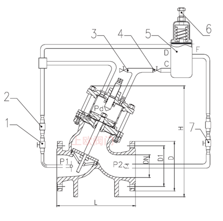 用于維持主閥上游供水壓力為一固定值,當上游水壓力大于設定水壓時,主閥迅速開啟泄壓。當壓力低于設定壓力時,主閥關閉持壓。